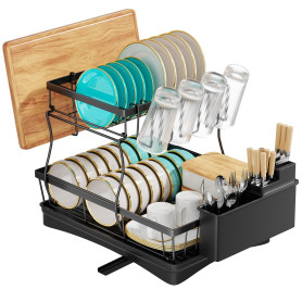 - Grande capacité et rangement multifonction : par rapport aux égouttoirs à vaisselle standard, ce design à double couche offre des options de rangement supplémentaires, y compris des sections dédiées pour les assiettes, les tasses et les couverts. Les rails surélevés autour des étagères empêchent les articles de glisser ou de se casser, ce qui le rend sûr et pratique.
